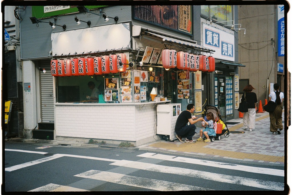 We decide to grand L.’s biggest wish every day: we find her an ice cream. She has been asking for it since she woke up. Julien knows a shop where they might sell kakigori, shaved ice. Its a shop that also makes Taiyaki, my personal favourite snack. Taiyaki is a fish shaped waffle filled originally with sweet red beans. Usually these stands offer many other fillings such as matcha, custard, chocolate, chestnut or black sesame.